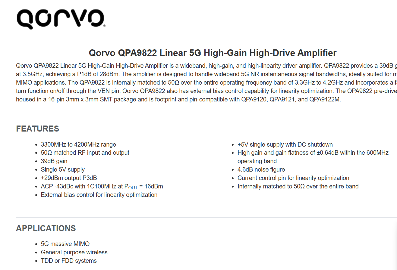 Qorvo's new QPA9822 linear 5G high-gain/high-drive amplifier is designed for 5G New Radio (NR) instantaneous signal bandwidth and 32-node massive MIMO systems in mobile infrastructure applications.