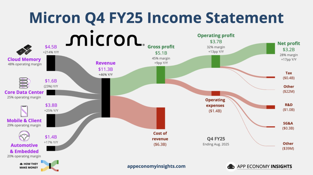 Micron Technology's fiscal fourth-quarter 2025 (three months ending August 28) earnings report, released after the market closed on September 23rd, exceeded Wall Street expectations, signaling a positive trend for AI investment and investors.Micron's fourth-quarter revenue reached $11.3 billion, a 46% year-over-year increase, topping analysts' expectations of $11.15 billion. Adjusted operating profit was $3.955 billion, up 126.6% year-over-year. Adjusted gross margin was 45.7%, up 9.2 percentage points year-over-year, exceeding analysts' expectations of 44.1% and the company's guidance of 44% to 45%, compared to 39% in the previous quarter. Micron's adjusted earnings per share were $3.03, exceeding market estimates of $2.84.